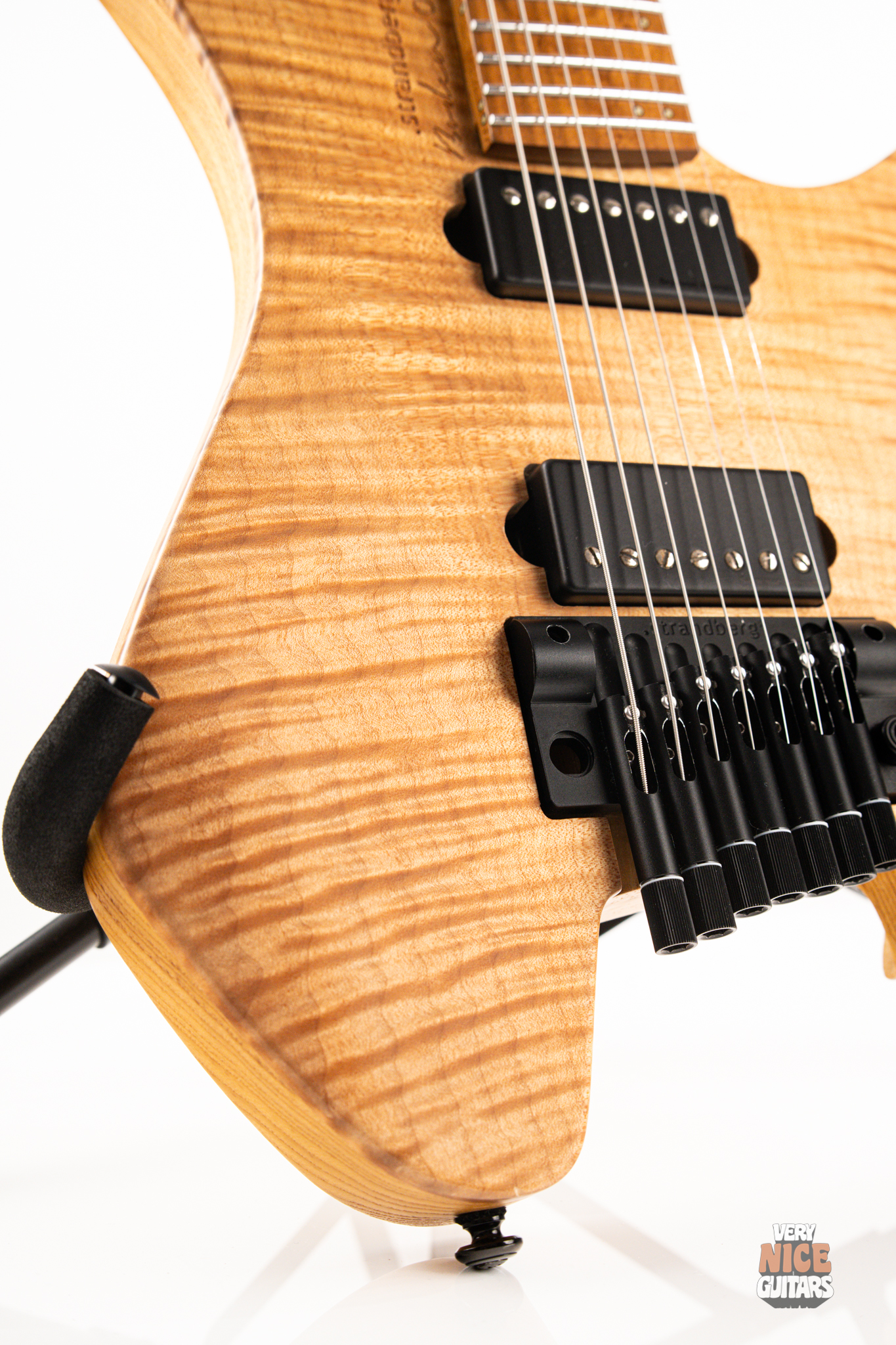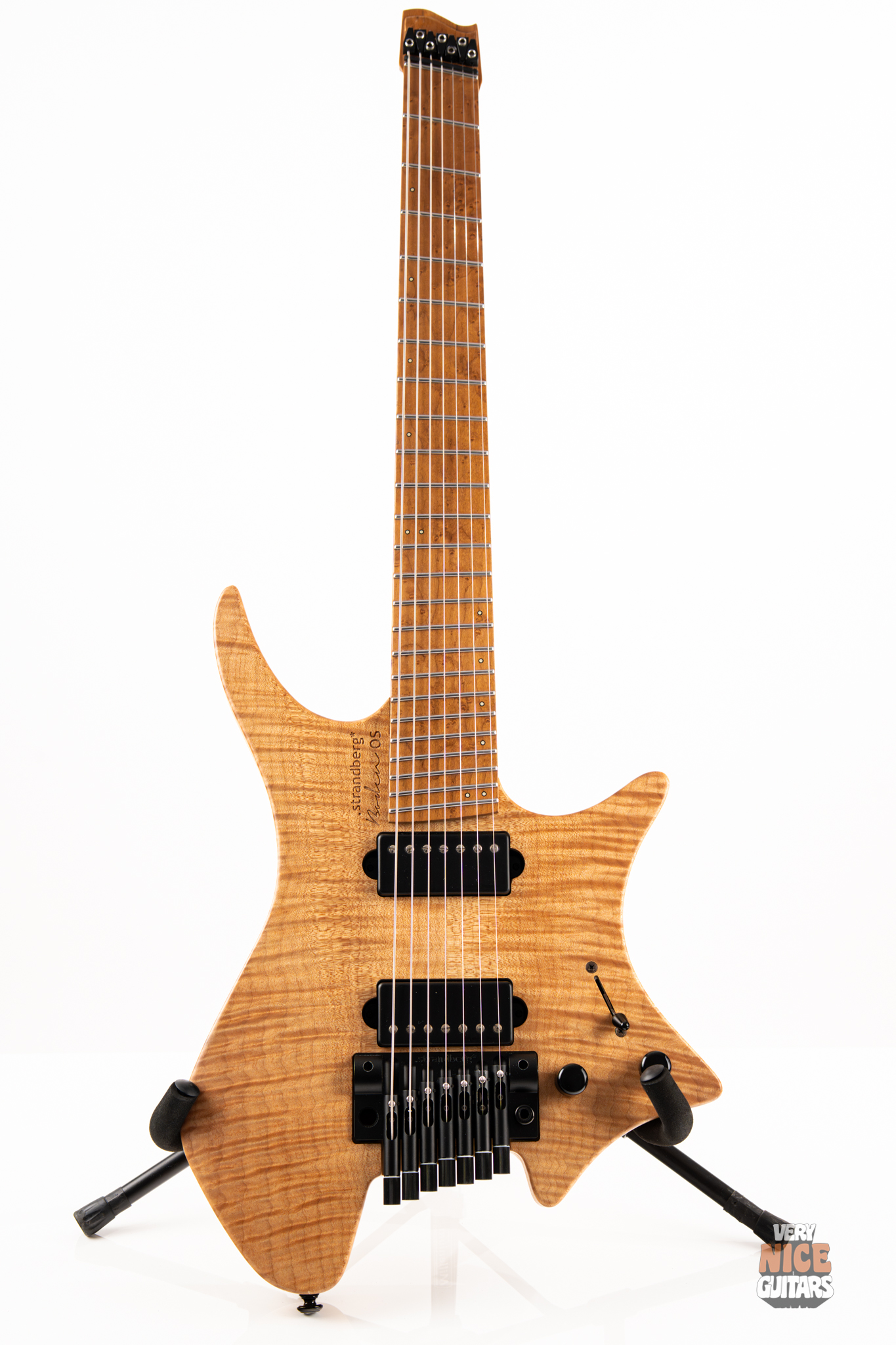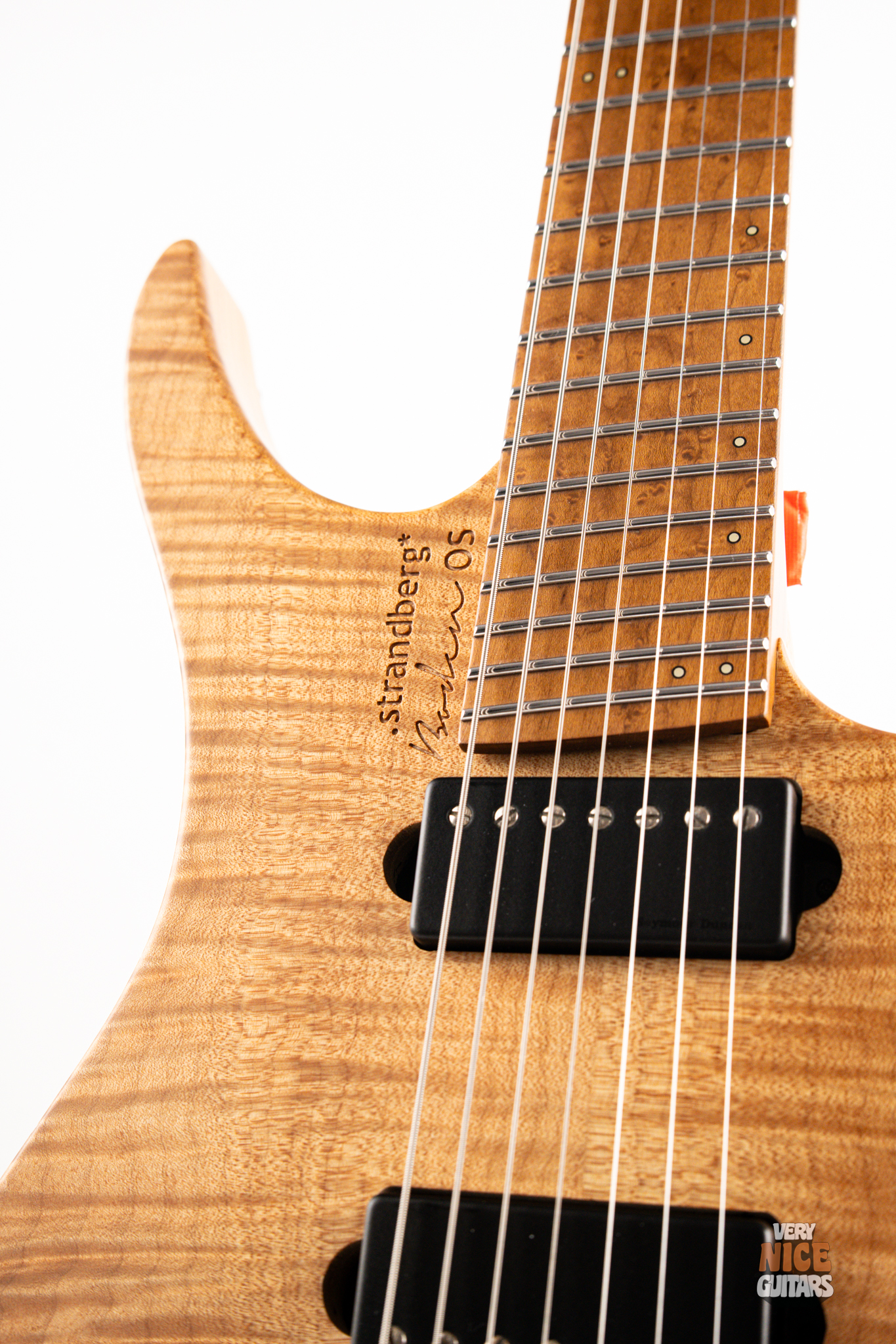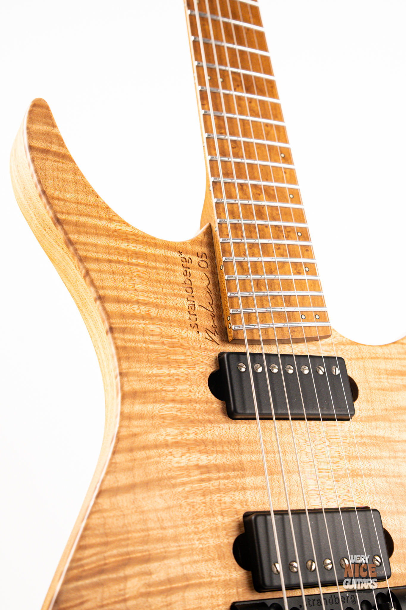 This seven-string monster features an elegant all-natural finish with an exceptional flame maple top. The Boden is renowned as one of the most comfortable extended-range guitars available, regardless of playing position. Attention to detail is outstanding throughout. The thick top, with an engraved Strandberg logo in a classic, old-school style, is truly eye-catching. A birdseye maple fretboard sits atop a roasted maple neck reinforced with carbon fiber, delivering impressively strong neck and excellent tuning stability. This version comes equipped with the easily modifiable Rev5 tremolo. The EndurNeck profile, combined with Jescar stainless steel frets, is a true game-changer for playability – give it time, and you’ll never look back. And yes, this beauty is loaded with Seymour Duncan Sentient and Pegasus pickups.