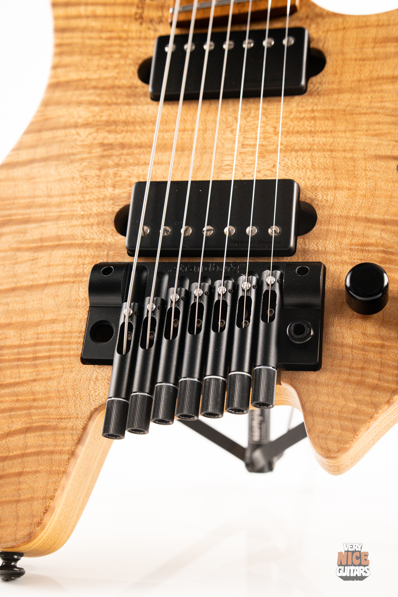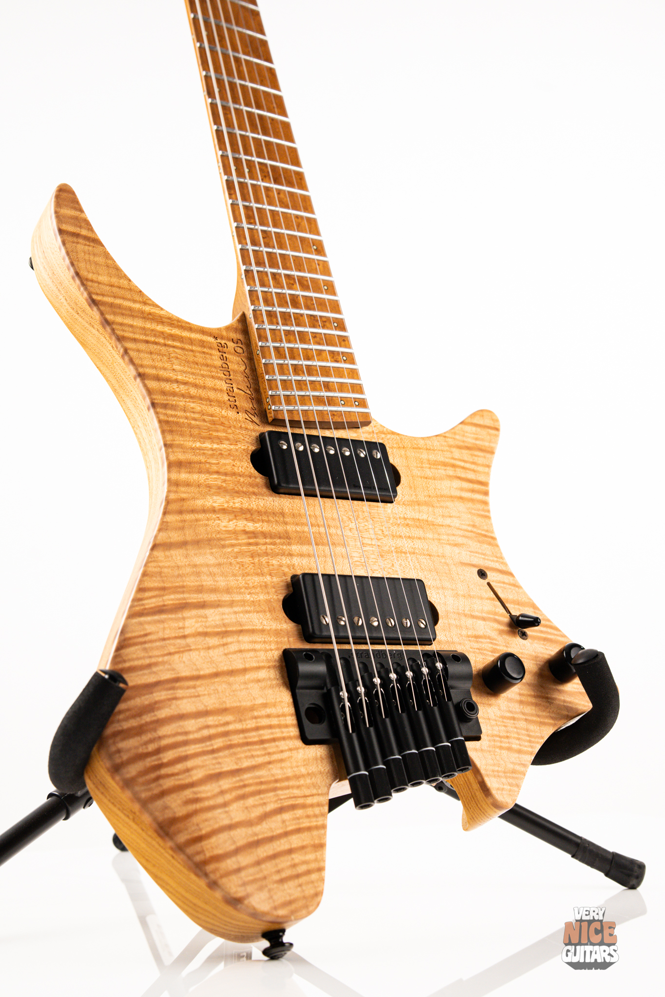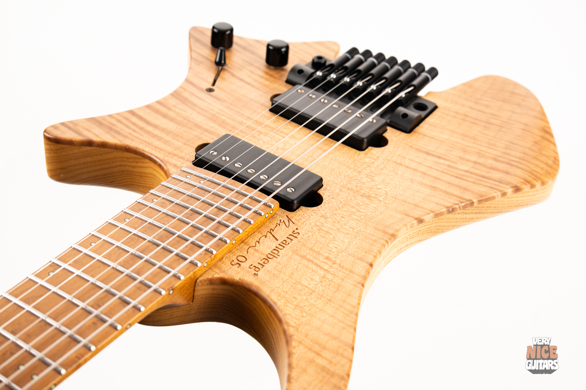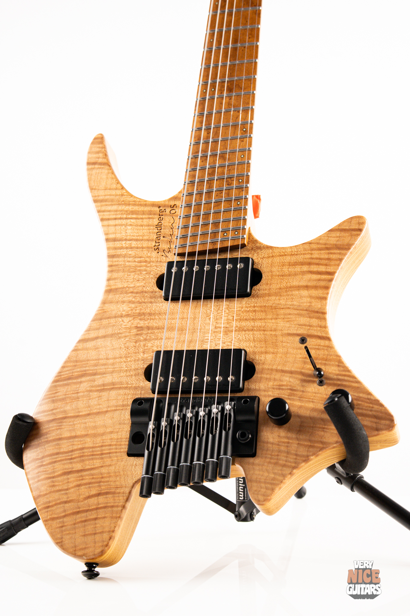 This seven-string monster features an elegant all-natural finish with an exceptional flame maple top. The Boden is renowned as one of the most comfortable extended-range guitars available, regardless of playing position. Attention to detail is outstanding throughout. The thick top, with an engraved Strandberg logo in a classic, old-school style, is truly eye-catching. A birdseye maple fretboard sits atop a roasted maple neck reinforced with carbon fiber, delivering impressively strong neck and excellent tuning stability. This version comes equipped with the easily modifiable Rev5 tremolo. The EndurNeck profile, combined with Jescar stainless steel frets, is a true game-changer for playability – give it time, and you’ll never look back. And yes, this beauty is loaded with Seymour Duncan Sentient and Pegasus pickups.