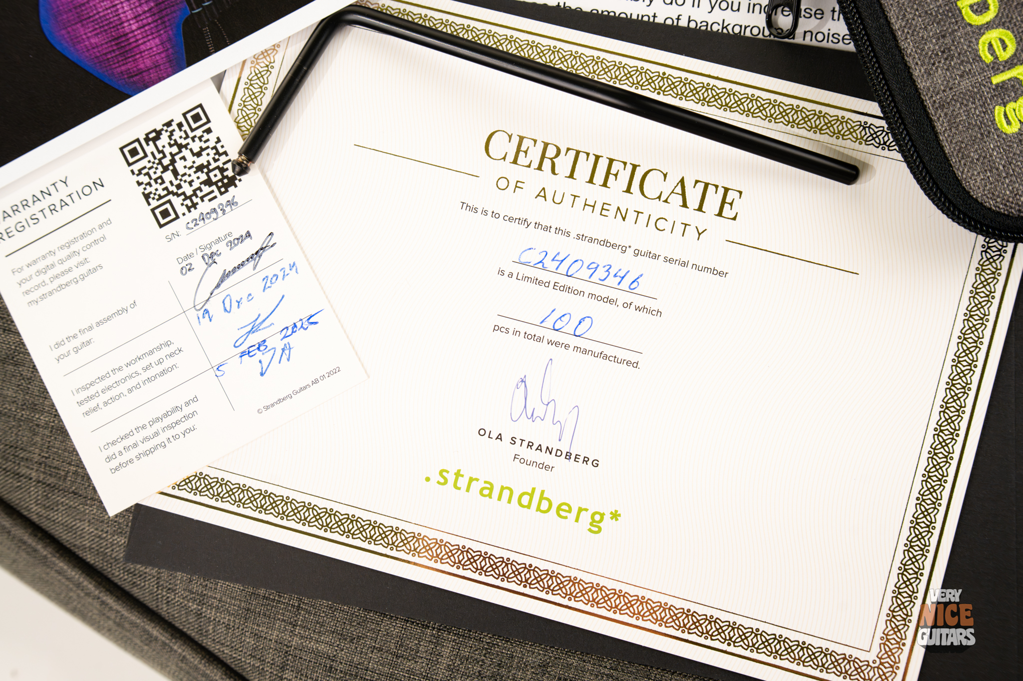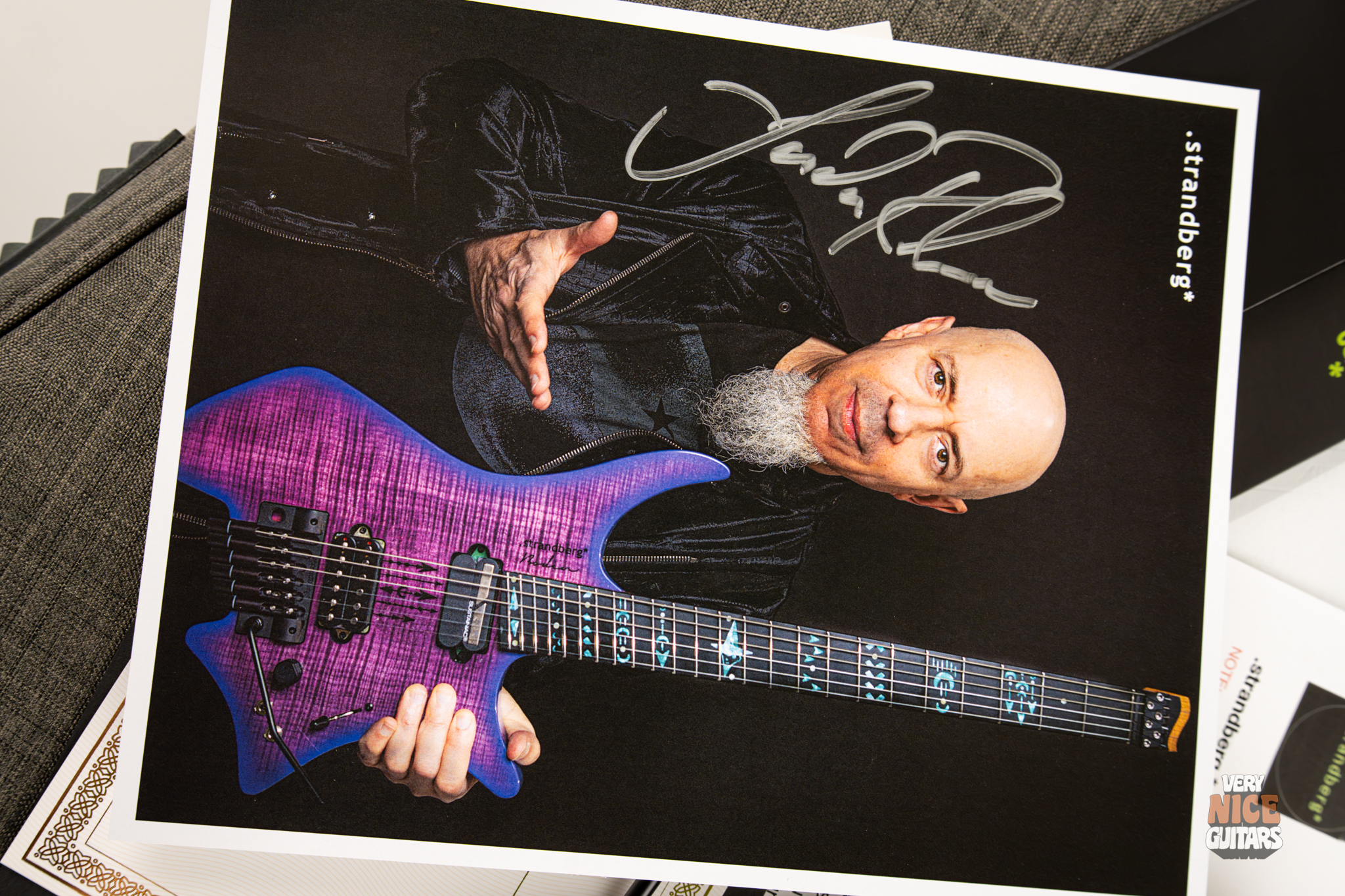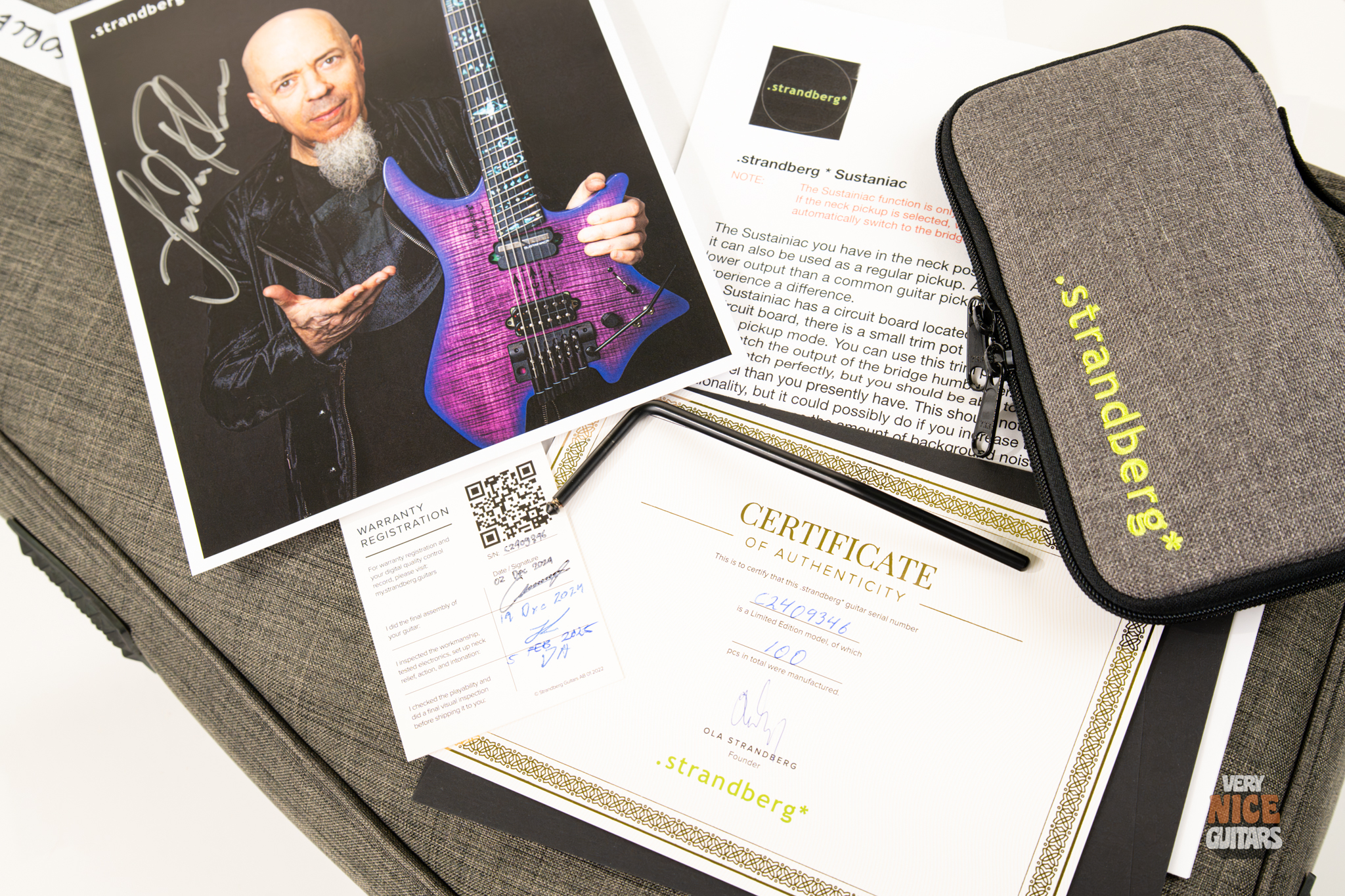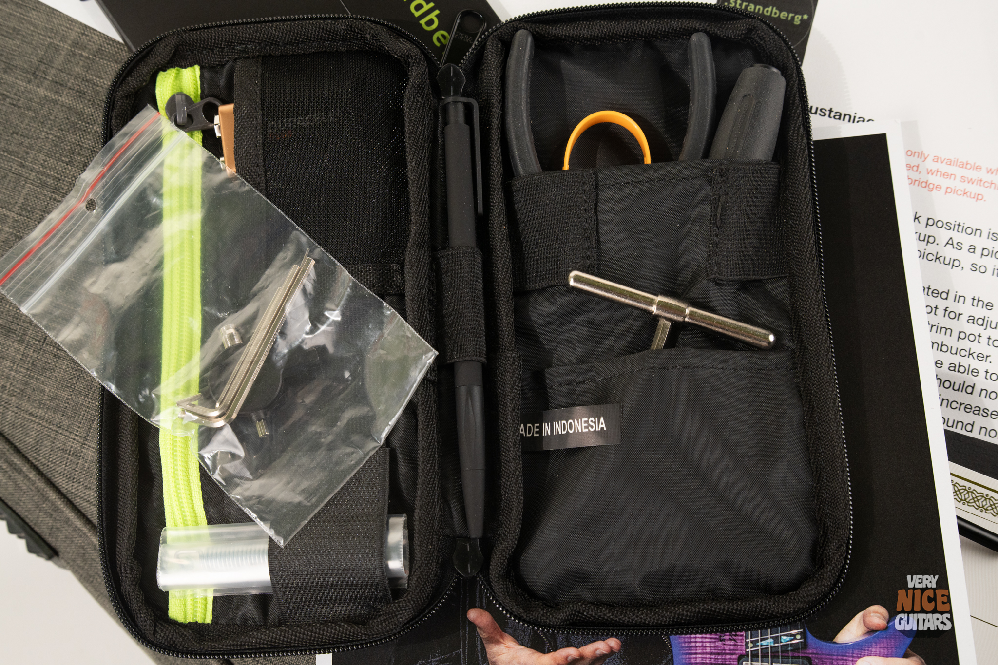 Includes original gig bag, allen wrench set, magnetic multitool, certificate of authenticity, ear plugs and tremolo bar, Strandberg toolkit, spare spring.